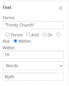 Select ‘within’ to narrow results to instances when the terms appear within a certain proximity to each other (ie search “Trinity Church” within 10 words of “Blyth” to help eliminate or reduce results for any other “Trinity Church”). This will help you narrow the results, even when you’re not sure what order the words will appear in.
