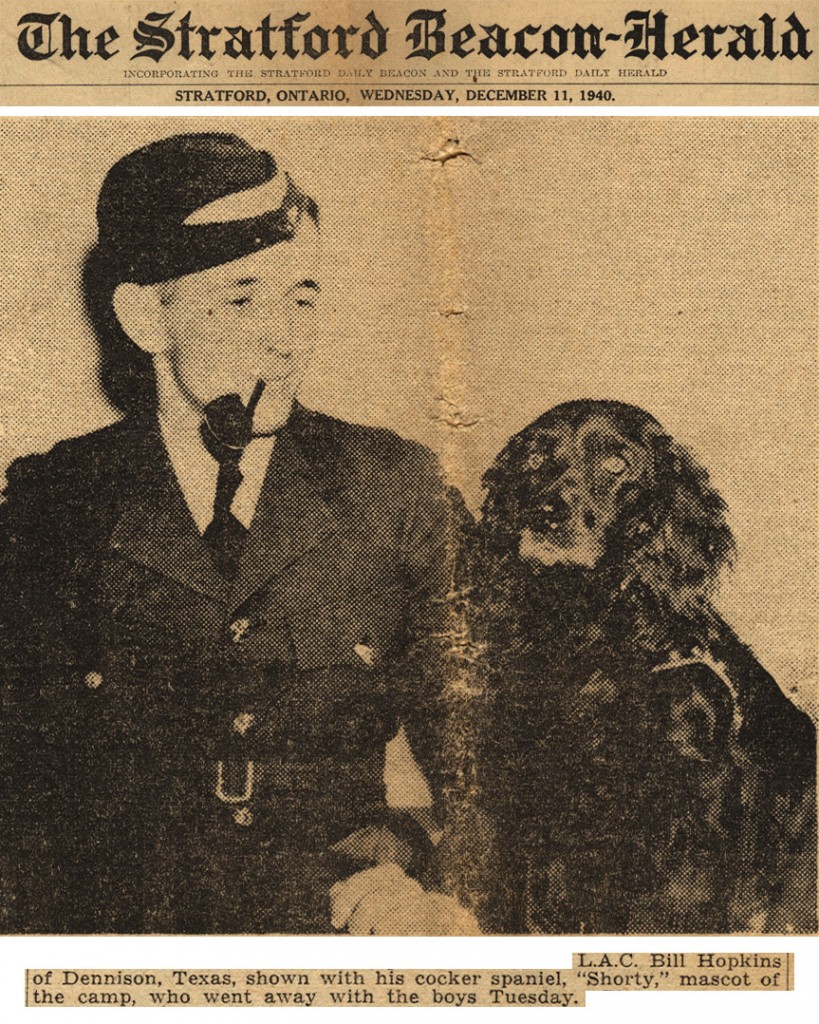 The first class dog of No. 12 EFTS was Shorty the cocker spaniel, pictured sitting with his owner, LAC (Leading Aircraftman) Bill “Tex” Hopkins of Dennison, Texas. Thanks to a clipping from the Stratford Beacon-Herald, we were able to confirm that Hopkins was Shorty’s owner, and that after graduation from No. 12 EFTS, he accompanied Hopkins to his next stage of training.