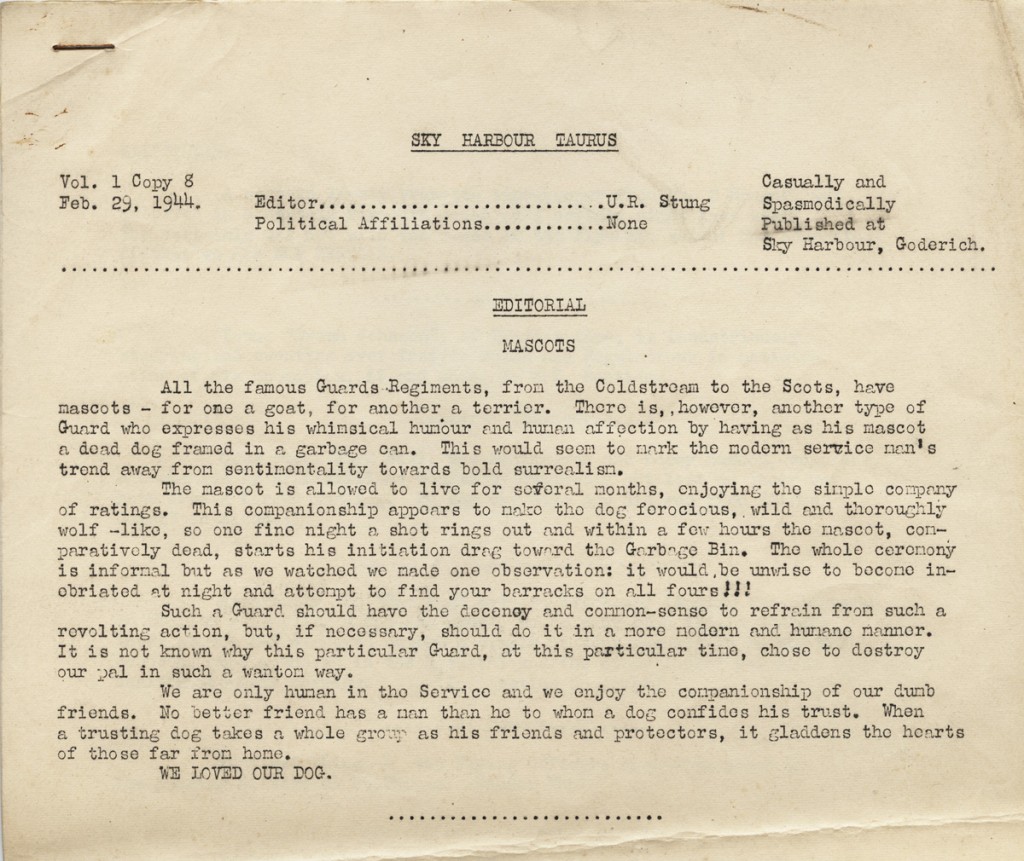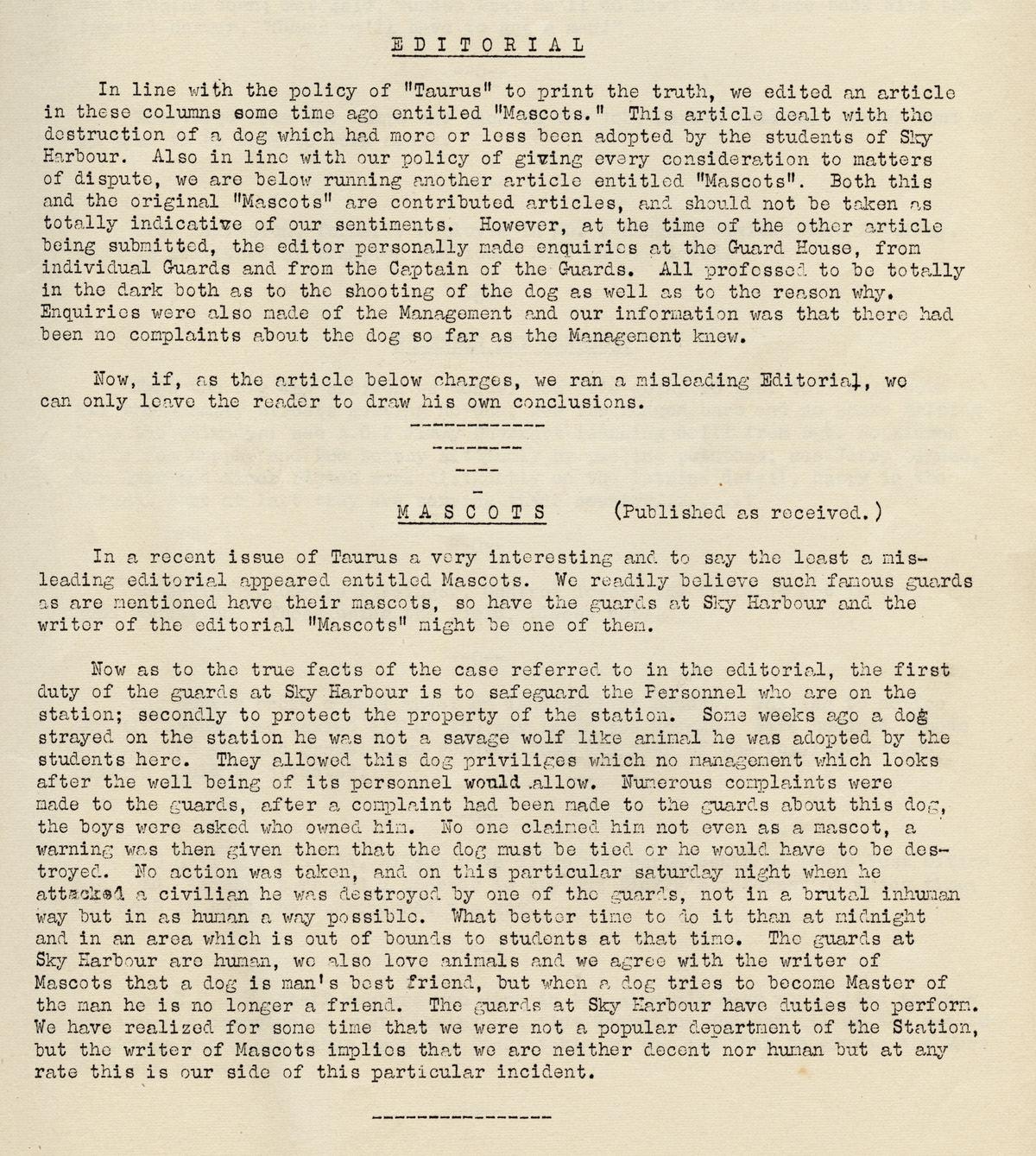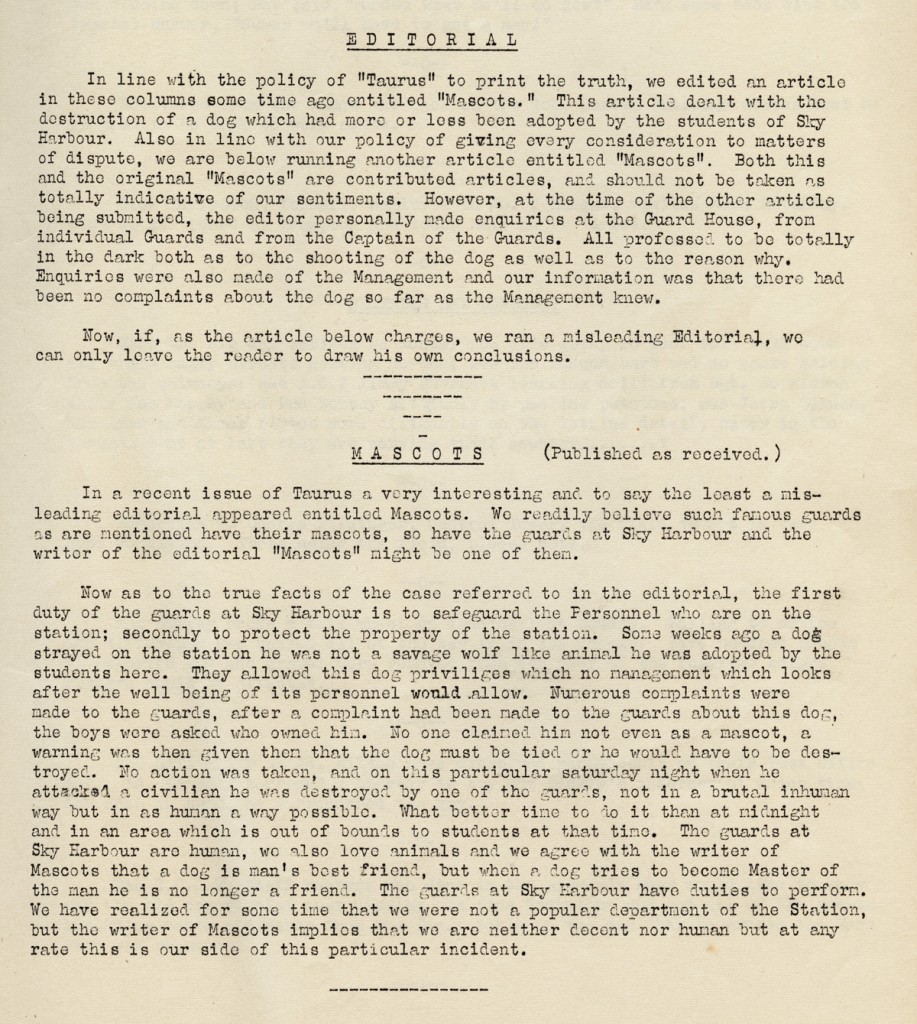 –TRANSCRIPT– Sky Harbour Taurus Vol. 1 Copy 10 March 14th, 1944 EDITORIAL In line with the policy of “Taurus” to print the truth, we edited an article in these columns some time ago entitled “Mascots.” This article dealt with the destruction of a dog which had more or less been adopted by the students of Sky Harbour. Also in line with our policy of giving every consideration to matters of dispute, we are below running another article entitled “Mascots”. Both this and the original “Mascots” are contributed articles, and should not be taken as totally indicative of our sentiments. However, at the time of the other article beting submitted, the editor personally made enquiries at the Guard House, from individual Guards and from the Captain of the Guards. All professed to be totally in the dark both as to the shooting of the dog as well as to the reason why. Enquiries were also made of the Management and our informatino was that there had been no complaints about the dog so far as the Management knew. Now, if, as the article below charges, we ran a misleading Editorial, we can only leave the reader to draw his own conclusions. — MASCOTS (Published as received) In a recent issue of Taurus a very interesting and to say the least a misleading editorial appeared entitled Mascots. We readily believe such famous guards as are mentioned have their own mascots, so have the guards at Sky Harbour and the writer of the editorial “Mascots” might be one of them. Now as to the true facts of the case referred to in the editorial, the first duty of the guards at Sky Harbour is to safeguard the Personnell who are on the station; secondly to protect the property of the station. Some weeks ago a dog strayed on the station he was not a savage wolf like animal he was adopted by the students here. They allowed this dog priviliges which no management which looks after the well being of its personnel would allow. Numerous complaints were made to the guards, after a complaint had been made to the guards about this dog, the boy were asked who owned him. No one claimed him not even as a mascot, a warning was then given them that the dog must be tied or he would have to be destroyed. No action was taken, and on this particular saturday night when he attacked a civilian he was destroyed by on of the guards, not in a brutal inhuman way but in as human a way possible. What better time to do it than at midnight and in an atea which is out of bounds to students at that time. The guards at Sky Harbour are human, we also love animals and we agree with the writer of Mascots that a dog is man’s best friend, but when a dog tries to become Master of the man he is no longer a friend. The guards at Sky Harbour have duties to perform. We have realized for some time that we were not a popular department of the Station, but the writer of Mascots implies that we are neither decent nor human but at any rate this is our side of this particular incident.
