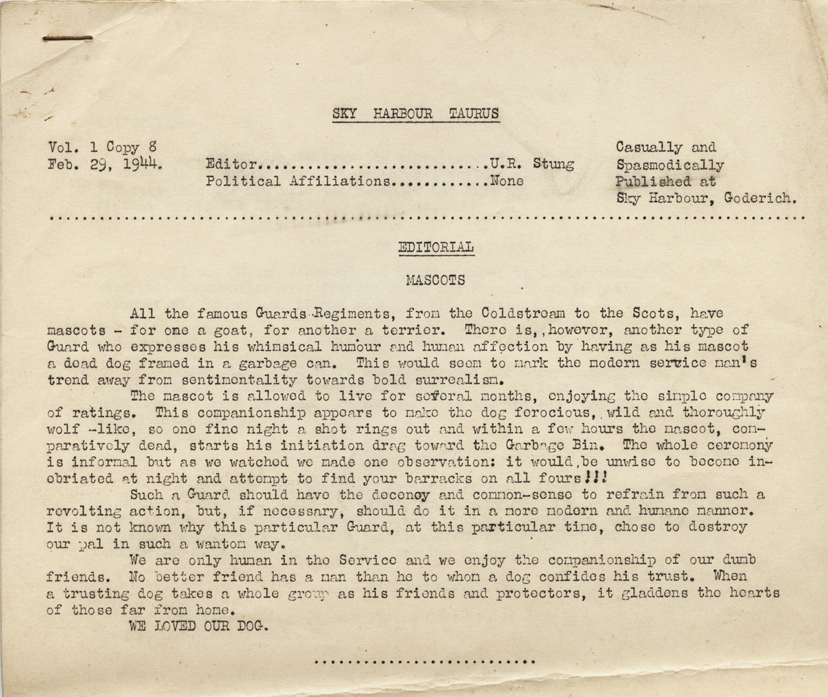 –TRANSCRIPT– Sky Harbour Taurus Vol. 1 Copy 8 Feb. 29, 1944 EDITORIAL MASCOTS All the famous Guards Regiments, from the Coldstream to the Scots, have mascots – for one a goat, for another a terrier. There is, however, another type of Guard who expresses his whimsical humour and human affection by having as his mascot a dead dog framed in a garbage can. This would seem to mark the modern service man’s trend away from sentimentality towards bold surrealism. The mascot is allowed to live for several months, enjoying the simple company of ratings. This companionship appears to make the dog ferocious, wild and thoroughly wolf-like, so one fine night a shot rings out and within a few hours the mascot, comparatively dead, starts his initiation drag toward the Garbage Bin. The whole ceremony is informal but as we watched we made one observation: it would be unwise to become inebriated at night and attempt to find your barracks on all fours!!! Such a Guard should have the decency and common-sense to refrain from such a revolting action, but, if necessary, should do it in a more modern and humane manner. It is not known why this particular Guard, at this particular time, chose to destroy our pal in such a wanton way. We are only human in the Service and we enjoy the companionship of our dumb friends. No better friend has a man than he to whom a dog confides his trust. When a trusting dog takes a whole group as his friends and protectors, it gladdens the hearts of those far from home. WE LOVED OUR DOG.