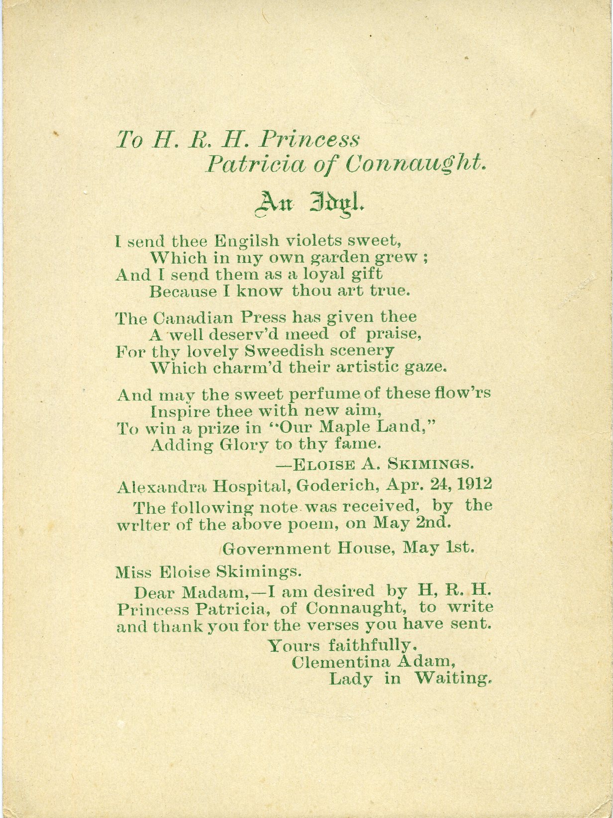 “__ presents her compliments to Mrs. Skimings, and is desired by her Royal Highness the Princess Louise to thank her extremely for the pretty song she composed for the birthday of Her Majesty the Queen. Her Royal Highness was much touched by Mrs. Skimings’ loyal expressions and graceful poetry.”