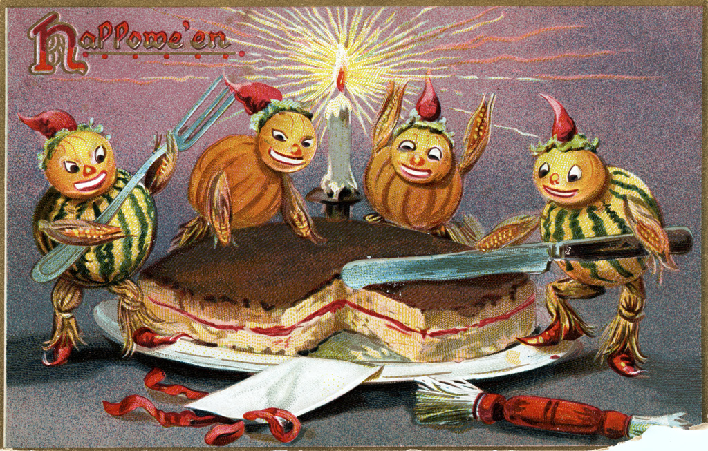 Happy Halloween! Behold this postcard image from our collection featuring pumpkin-headed melon people cutting a cake to mark the day. Every year, I marvel at this image and wish that vegetable people were still a common Halloween motif. The postcard itself was sent on October 31, 1908 from Helen to Mrs. G. H. Green in Goderich, and is part of a series of Hallowe’en postcards by British publisher Raphael Tuck & Sons. These kinds of postcard images were very common during the postcard boom of the late 1800s and early 1900s, and if you’re looking for more, check out some additional examples from the Toronto Public Library’s Halloween postcard collection.
