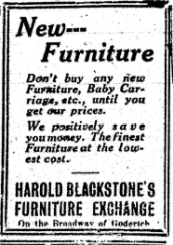 References to Blackstone’s in The Signal, available online through the Digitized Newspaper Collection, date back to as early as 1908. At this point, Blackstone’s was a restaurant that served oysters, ice cream, and confectionaries. By 1930 it had expanded to sell furniture as well, and was known as Blackstone’s Furniture Exchange, as shown in the ad at right published in the Goderich Star in 1928. It was around this time that the owner, Harold Blackstone, christened West Street as ‘The Broadway of Goderich’, as shown in the newspaper clipping published in The Signal in 1930.