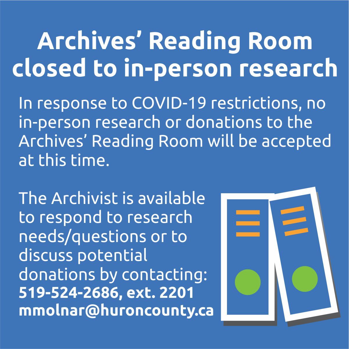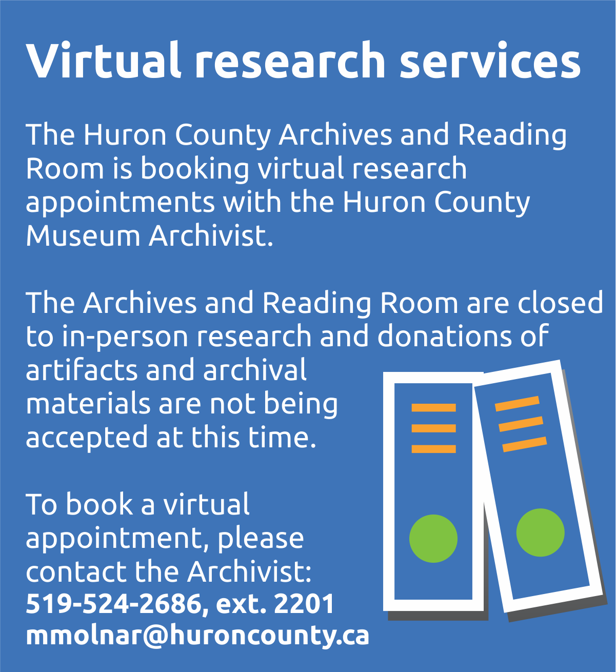To learn more about the services available at the Archives and Reading Room, or to book a research appointment, please contact the Huron County Museum Archivist at 519-524-2686, ext. 2201, or email mmolnar@huroncounty.ca.