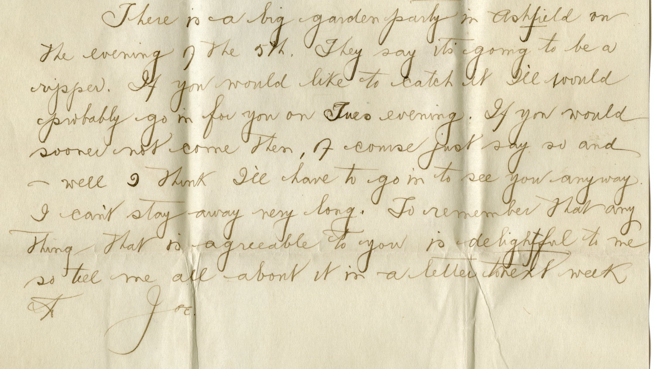 Sixteen letters in total were donated to the Museum’s archival collection, all written by a young Ashfield Township man named Joe during the years of 1913 through 1917 to Mary Frances Griffin. The correspondence between Joe and Mary took place after she had moved to Chicago after a time spent living in the Kingsbridge area. The letters were eventually passed down to her grandson, David Hammer, of Palatine, Illinois, who kindly donated them to the Museum.