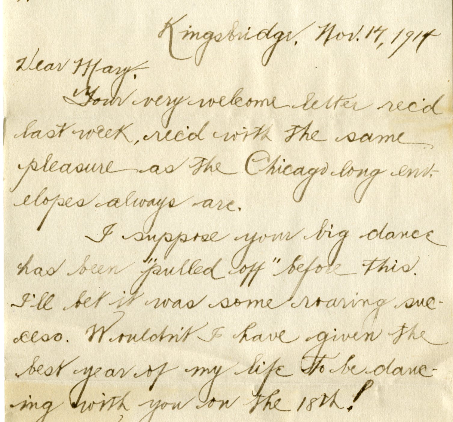 In donating the letters, David wrote the following about his grandmother: “When Mary’s father, Timothy Griffin, died in Marquette, Michigan, Mary was sent to live with her aunts and uncles in Kingsbridge [Huron County]. She lived there from 1910 to 1912 and in the following years returned many times during the summer. Sundays she went to church. Weekdays she did chores, working in the garden, helping with cooking and cleaning. On Saturday nights the big excitement was to go dancing with friends and come home late. And always the question: Who was getting serious with whom? The possibilities were endless!”