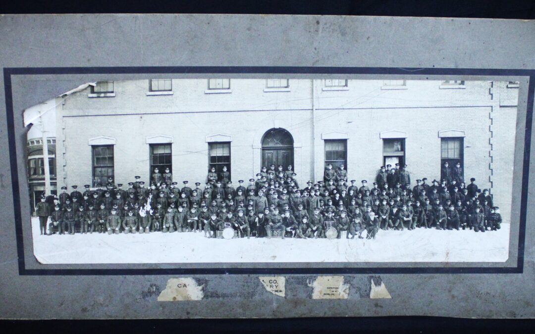 Recently, the Huron County Museum began the transfer of artifacts from the (now-closed) North Huron Museum. Among the items was this image of a group of World War One soldiers (object number 2023.0067.352). Unfortunately, the original label has worn off and the North Huron documentation did not have in-depth detail. The only information was the name of one of the photographed soldiers, his wife, and the donor’s name.