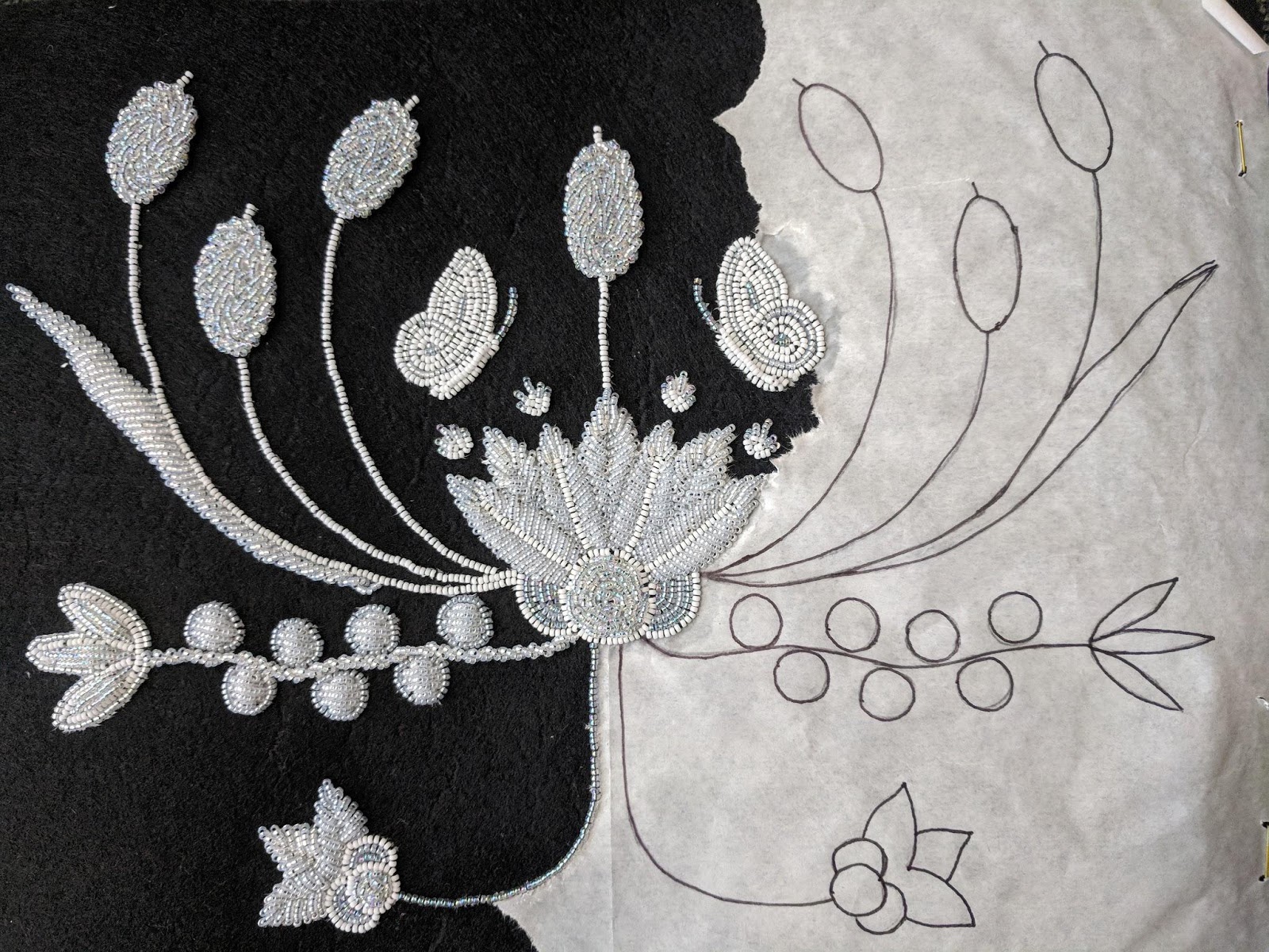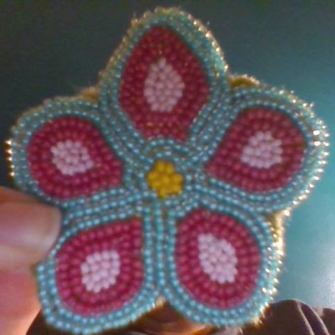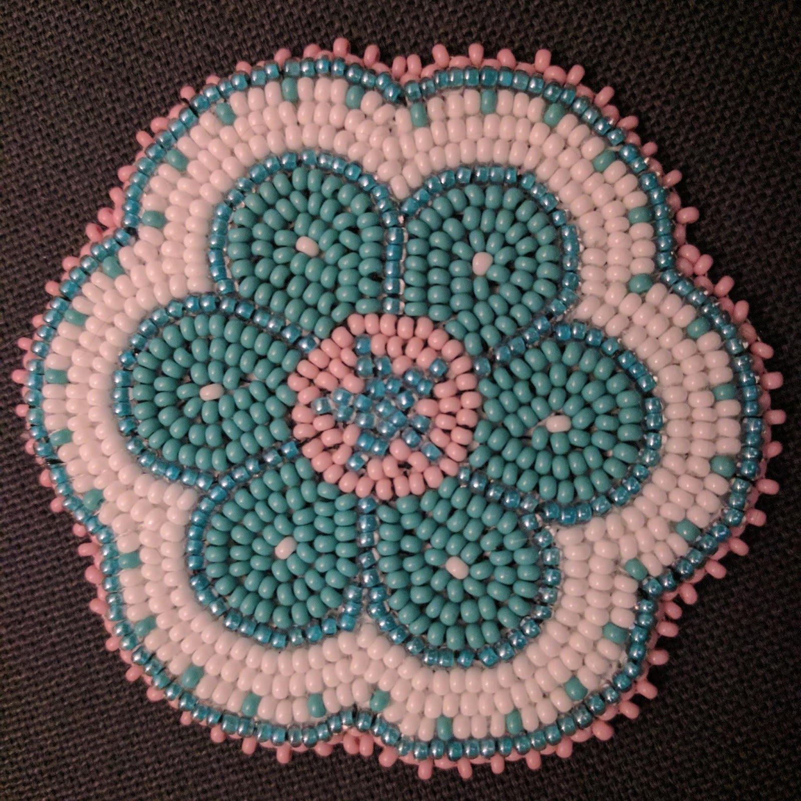 I learned how to bead embroider when I was at the Canadian Museum of History from a fellow intern friend who is Métis. Her sister is a beader and invited me to go [to] an evening  bead workshop. Unfortunately, it was [so] far by bus to get to the workshop that I only was able to spend less than a half hour with them – and from then on was not able to continue going to the classes. However, this was enough time to teach me the basics and…me and my two fellow intern friends continued to bead on our lunch breaks.