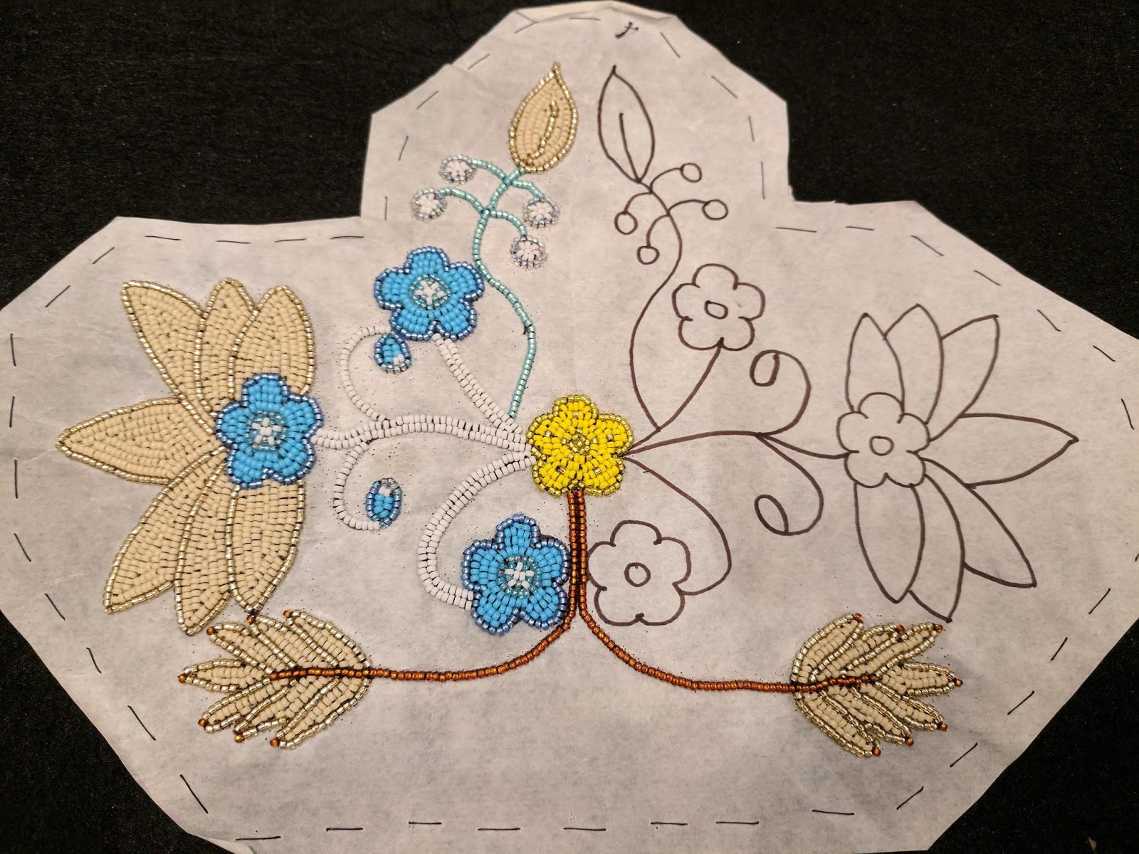 I started beading when I was really young. My mother beaded a lot and she often got me to sort out beads that were mixed together in a cookie tin. She first started teaching me by doing bead loom work and simple jewellery. However, once her eyes started to bother her while she beaded and circumstances changed in our family, beading went out of my mind. It wasn’t until many years later in my late 20s that my passion was reignited when I did some volunteer work at the Woodland Cultural Centre. For one of the months I was there I worked in the Education department – I didn’t have much knowledge that I could offer unfortunately, so I was asked to do some beadwork for game prizes. From there, I moved to Gatineau, Quebec where I got an internship at the Canadian Museum of History for Indigenous, Inuit, and Metis peoples who are pursuing training in museum work (Aboriginal Training Program in Museum Practices); it was there where I learned how to do bead embroidery, which I commonly do now.