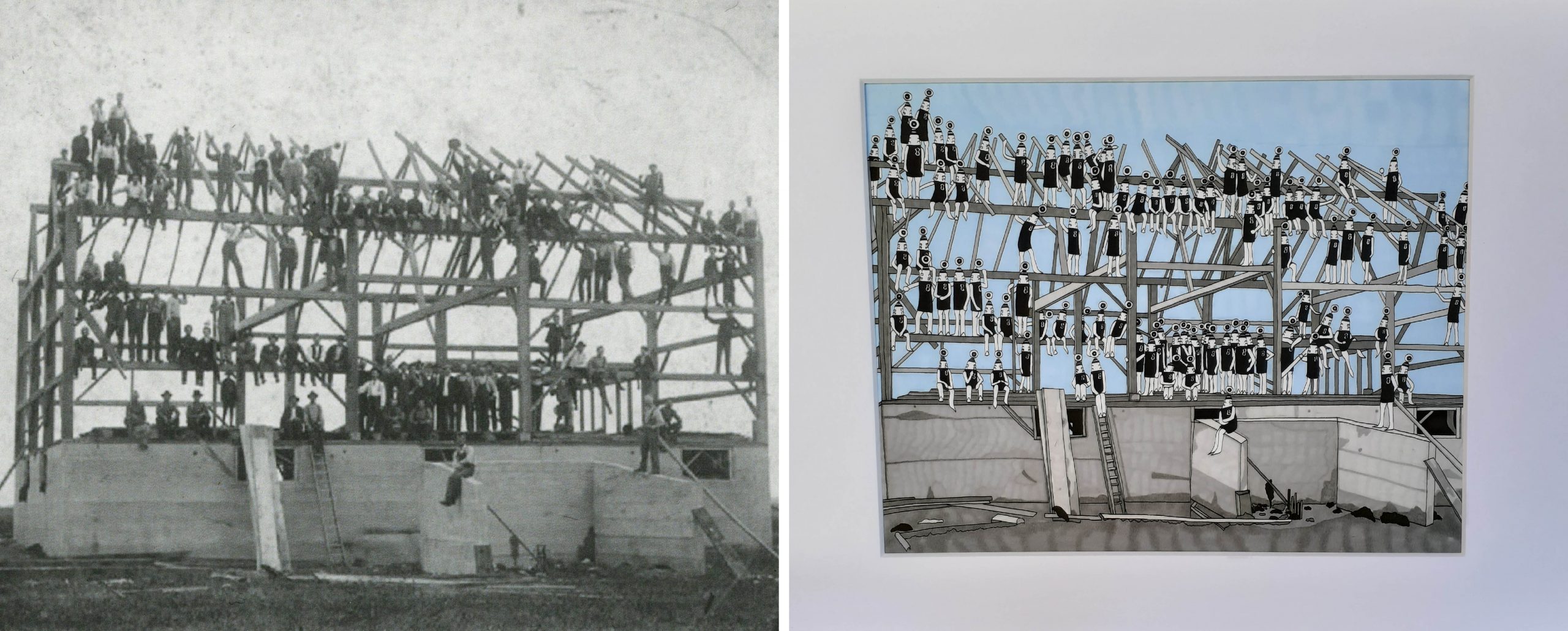 Artist Kelly Stevenson was inspired by this photo of a barn raising in Ashfield Twp. from the Museum’s collection, at left, to create this illustration, at right.