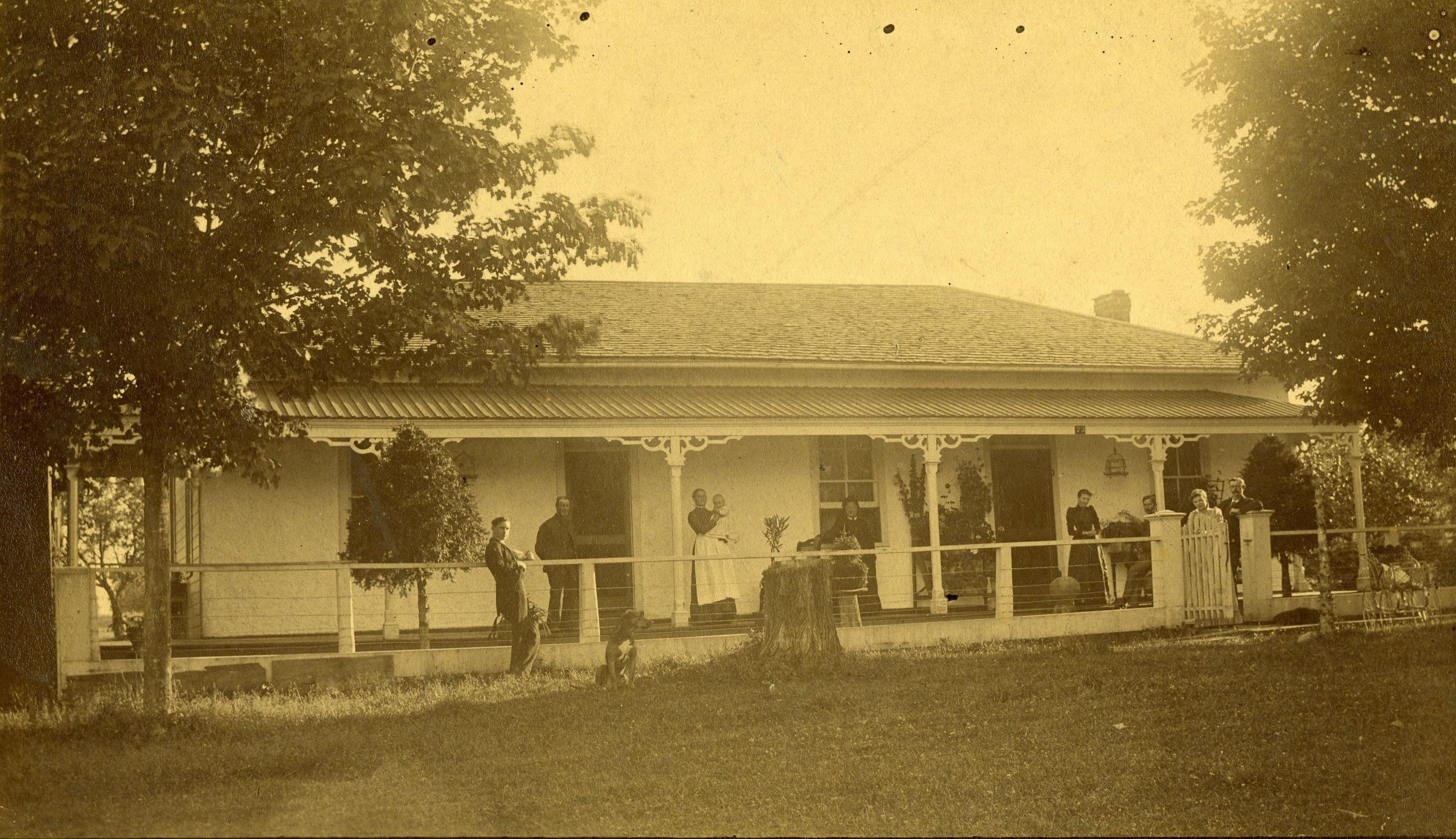 After Joseph’s death, Margaret and Celina remained in the Brussels area. Celina married Thomas Ballantyne in the fall of 1862 and the couple made their home on the bank of the Maitland River in the spring of 1863. The home is pictured above with the family sitting on the front porch around 1892. Shown here, from left to right, are Jack Ballantyne, Thomas Ballantyne, Celina Ballantyne holding Bill Strachan, Margaret Hodskinson, Annie and Alex Strachan, and Jenny and Joe Ballantyne.