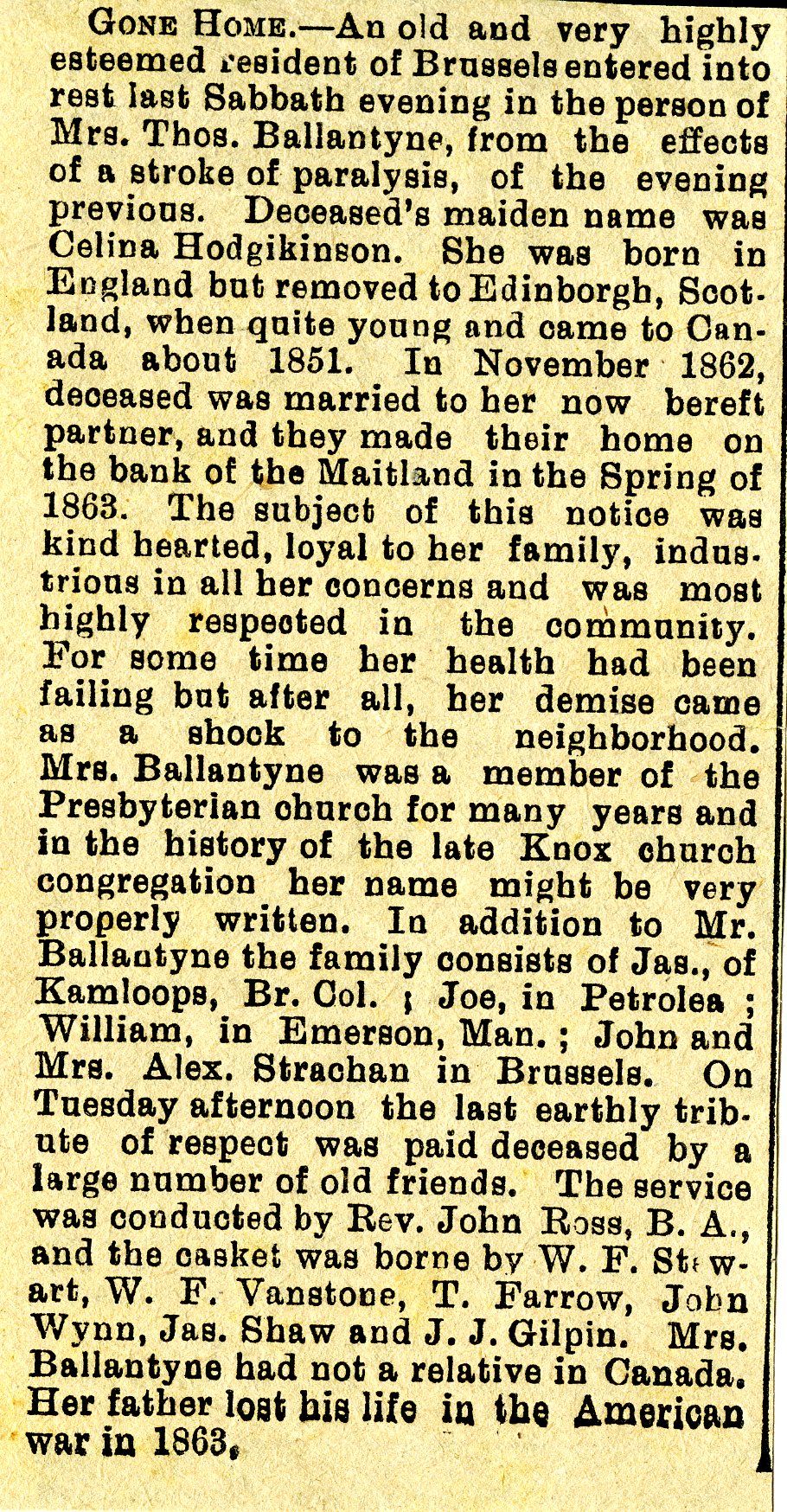 Celina and Thomas had a daughter named Annie who married Alexander Strachan in Brussels in 1889. The couple owned a dry goods store in the village.