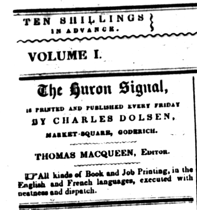 The Signal was the first newspaper printed in Huron County, beginning on February 4, 1848. Published in Goderich by Charles Dolsen, and edited by Thomas Macqueen (or “McQueen”), it promised to deliver “as many Essays and as much knowledge on all subjects of practical importance, as our space and time will reasonably allow,” Huron Signal (February 4, 1848), 2.