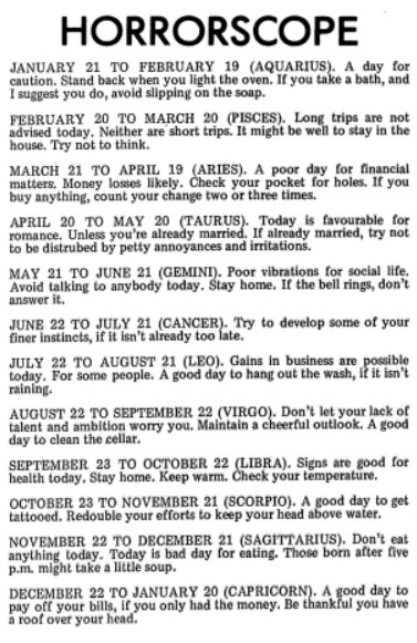 Even small editorial changes which found room for community announcements, movie showtimes, advice columns and crossword puzzles were intended to position local news so that papers provided little bouts of day-to-day wisdom, small-town gossip and casual distraction. In an October edition of the Exeter Times-Advocate published in 1969, readers were treated to a horrorscope, an inverted horoscope which only offered bad advice. Pisces were told that “Long trips are not advised today. Neither are short trips. It might be well to stay in the house. Try not to think,” whereas Capricorns were reminded it was “A good day to pay off your bills, if you only had the money. Be thankful you have a roof over your head,” (Exeter Times-Advocate, Oct. 23, 1969, pg. 9)