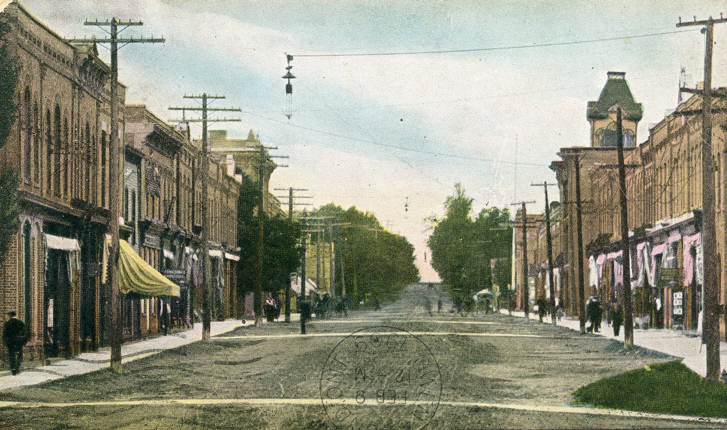 Postcard of Goshen Street, Zurich, ON, dated July 4, 1910. Visible businesses P. Benders and Co. headquarters for Boots and Shoes. The steeple in the background is the Lutheran Church. Huron County Archives, A991.0052