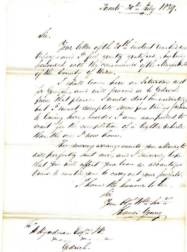 Letter from Thomas Young expressing his opinion and pleasure to take on the Gaol contract for Huron County.