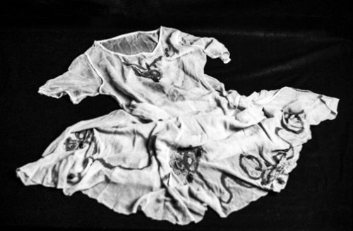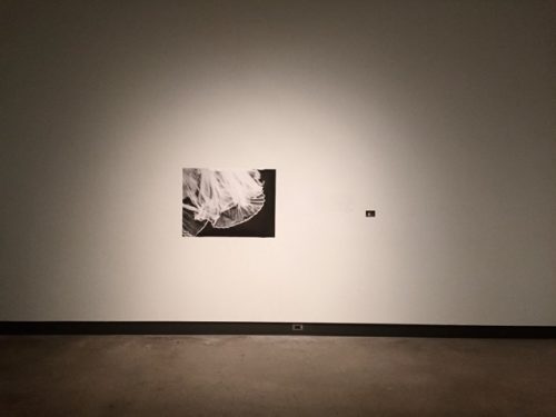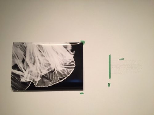 Step Lightly (2017) Pigment print on luster paper and graphite This is the beginning piece of the exhibition. The photo features the train of Jean (Scott) Taylor’s wedding dress and is accompanied by personal writing in graphite directly on the wall next to the image so that it can only be seen up close. A smaller image is hidden to the side of the text of an old bottle of Potassium Chlorate medication.