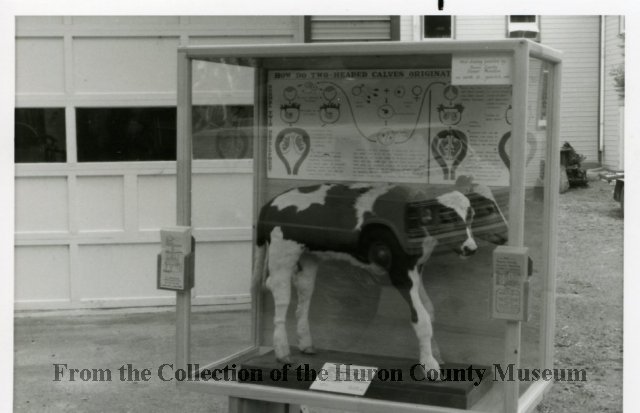 The second, a male Friesian Holstein calf, was born with two heads, two tails and one set of organs in 1936 on William Long’s farm in Colborne Township. Dr. Meyers of Goderich was the veteranarian. The calf was mounted by a taxidermist from Toronto.